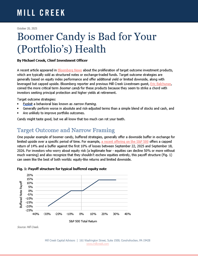 A recent article appeared in Bloomberg News about the proliferation of target outcome investment products, which are typically sold as structured notes or exchange-traded funds. Target outcome strategies are generally based on equity index performance and offer additional yield or limited downside, along with leveraged but capped upside. Bloomberg reporter and previous Mill Creek Livestream guest, Eric Balchunas, coined the more critical term boomer candy for these products because they seem to strike a chord with investors seeking principal protection and higher yields at retirement.