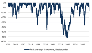 Equity markets took a breather last week against the backdrop of an above-average year. The sell-off was mainly concentrated in US growth and technology stocks, which includes AI-exposed firms like NVIDIA, Microsoft, and Alphabet. Media coverage, in our opinion (e.g. “Dow plunges 613 points as AI bubble fears explode”), was overblown: