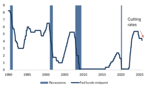 - The Federal Reserve has embarked on a rate-cutting cycle, which typically happens after growth has slowed considerably or during a recession (Fig. 6).