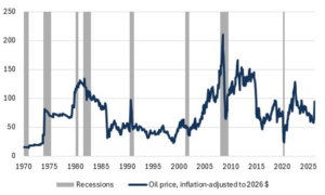 Fig. 1: Historical oil prices and recessions