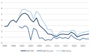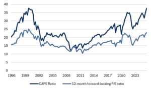 Valuations are very poor predictors of returns over periods of less than 7 years, but we won’t pretend gravity doesn’t exist. Absent an earnings boom (AI?), investors are looking at muted long-term US equity returns from this valuation starting point.